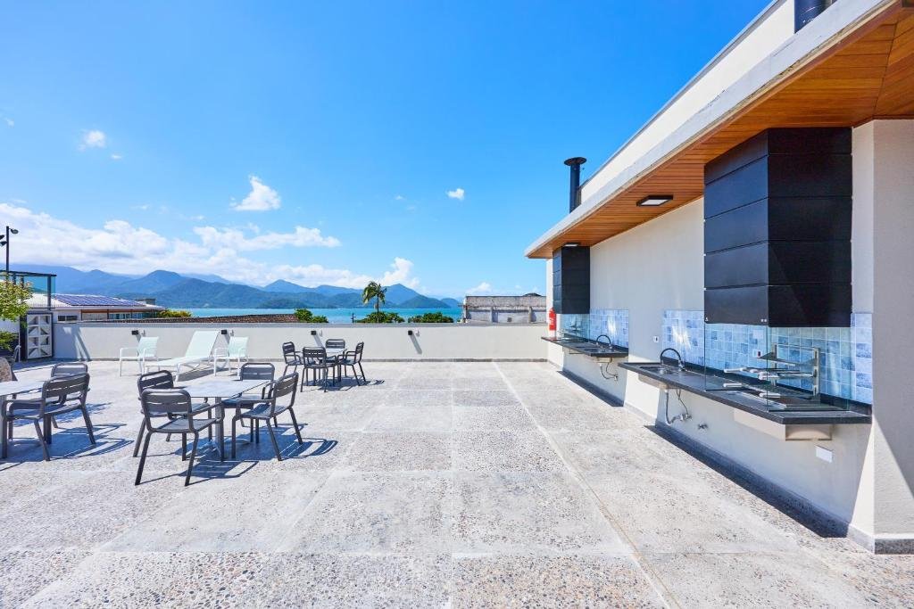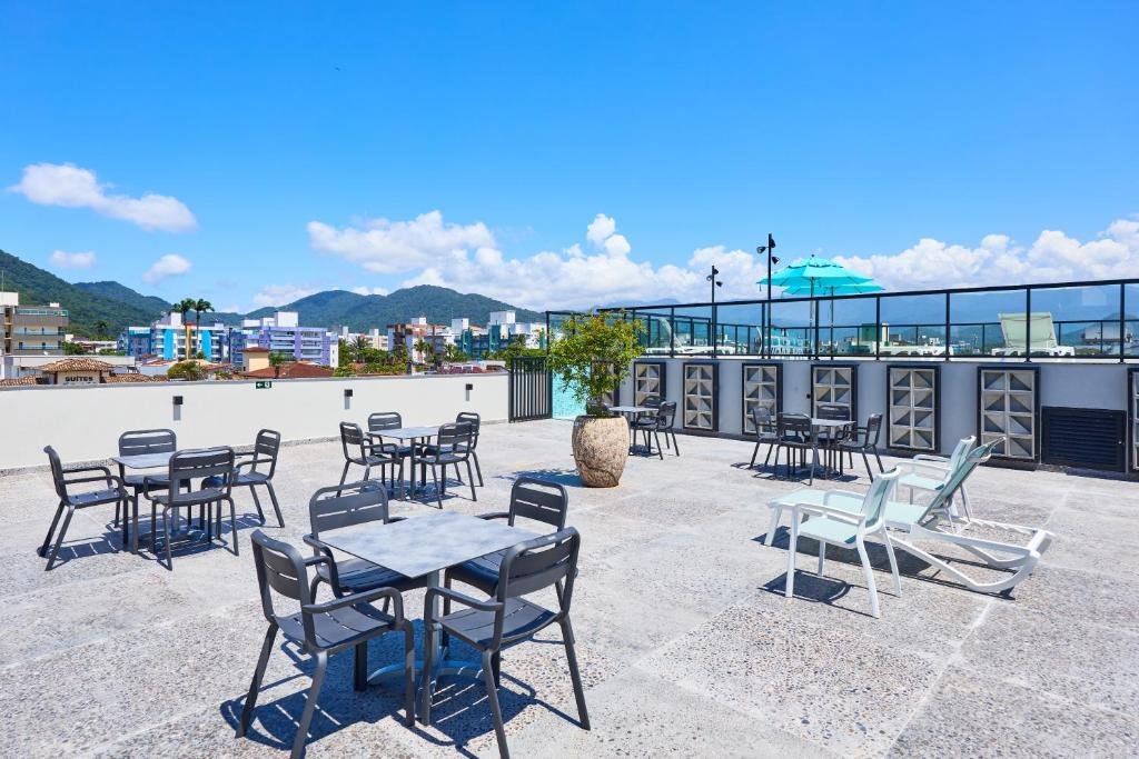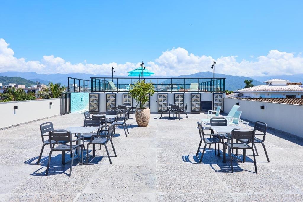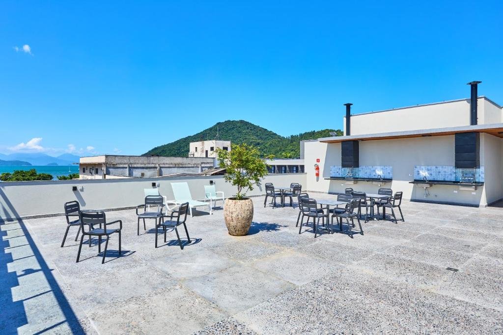 Esses espaços permitem que os hóspedes apreciem a paisagem do litoral e o clima agradável de Ubatuba, sendo ideais para relaxar, tomar sol ou simplesmente contemplar o entorno. O terraço complementa a proposta do hotel de oferecer ambientes externos integrados à natureza, criando um cenário tranquilo para pausas ao longo do dia ou momentos de descanso no final da tarde.