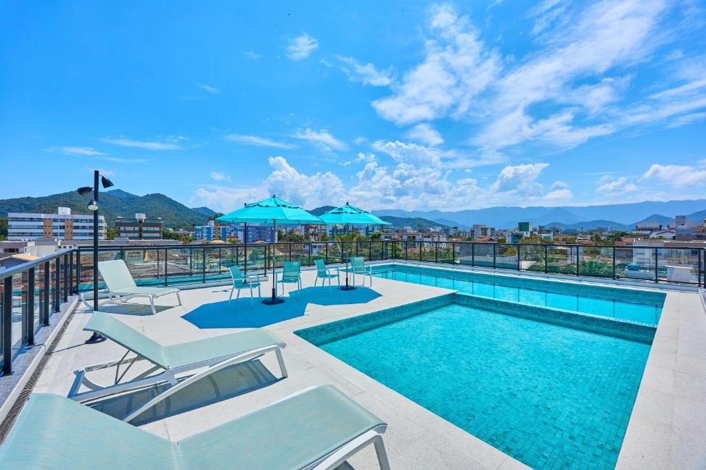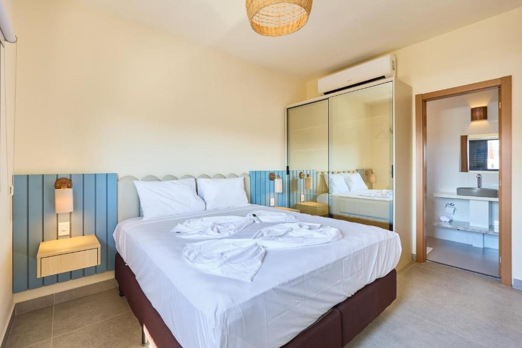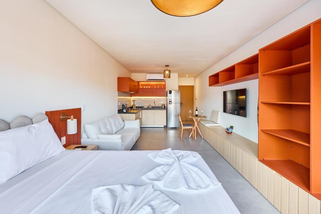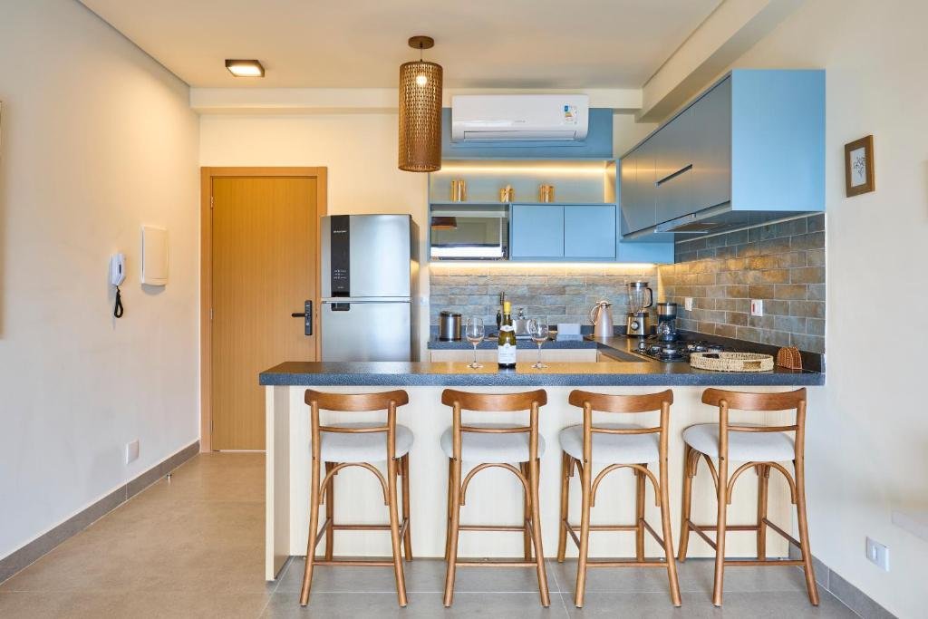 O estabelecimento funciona no modelo de apart-hotel e oferece acomodações modernas com diferentes tamanhos, incluindo lofts e apartamentos equipados com cozinha completa, ar-condicionado, Wi-Fi, TV e varanda, muitos com vista para o mar.