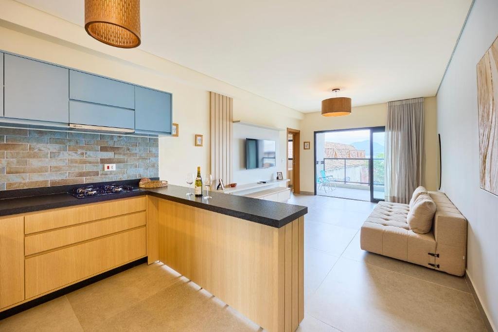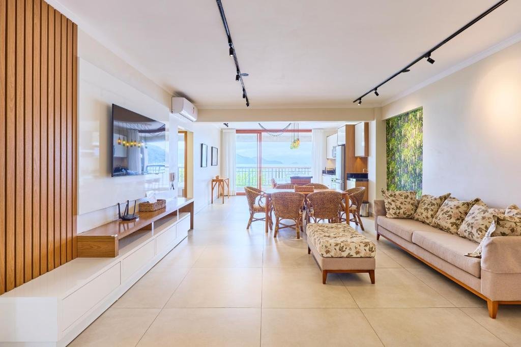 Ideal para até quatro pessoas, o Apartamento Superior oferece maior amplitude e varanda com vista para o mar. A acomodação possui quarto com cama de casal, sala de estar com sofá-cama, cozinha completa, ar-condicionado, TV e Wi-Fi, além de banheiro privativo. O espaço é indicado para hóspedes que buscam mais conforto e uma experiência de hospedagem com visual privilegiado da orla de Itaguá.