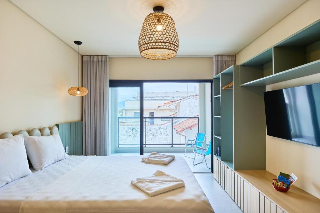 O Loft Casal é uma acomodação compacta e moderna, ideal para até duas pessoas. O espaço integra quarto e área de estar em um ambiente funcional, equipado com cama de casal, ar-condicionado, TV, Wi-Fi e cozinha compacta com utensílios básicos. A unidade também conta com banheiro privativo e varanda, proporcionando conforto para casais que buscam praticidade e independência durante a estadia em Ubatuba.