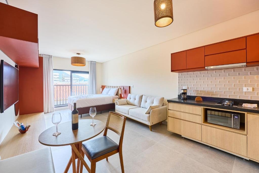 O Apartamento Standard pode acomodar até quatro pessoas e apresenta estrutura completa para estadias mais longas. A unidade conta com quarto com cama de casal, sala com sofá-cama, cozinha equipada com utensílios e eletrodomésticos básicos, ar-condicionado, TV e Wi-Fi, além de banheiro privativo e varanda. É uma opção prática para quem deseja unir conforto e funcionalidade.