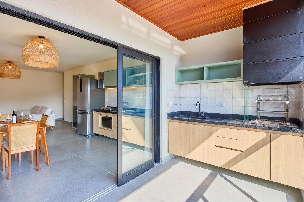 O espaço é integrado a áreas externas da propriedade, favorecendo encontros informais e refeições em grupo, algo comum em hospedagens no modelo apart-hotel. Essa estrutura é especialmente valorizada por hóspedes que preferem preparar suas próprias refeições ou reunir grupos em um ambiente relaxante.