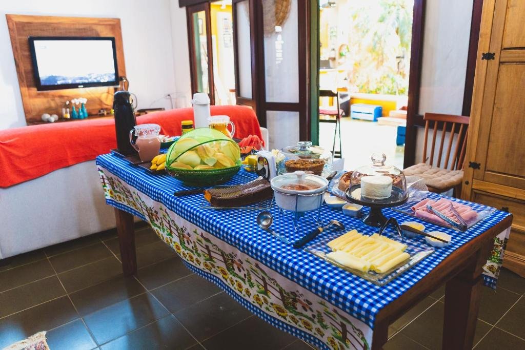 A refeição inclui frutas frescas da estação, pães variados, bolos e doces preparados na própria cozinha, além de opções como iogurtes, frios e cereais. Também são disponibilizadas bebidas quentes, como café e leite, e sucos naturais, complementando o cardápio.