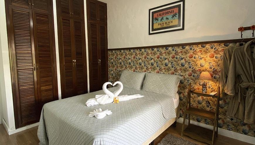 A Suíte com Hidromassagem é indicada para até 2 pessoas e oferece uma experiência de hospedagem mais exclusiva. Além de cama de casal, ar-condicionado, TV, frigobar, Wi-Fi e banheiro privativo, a acomodação dispõe de banheira de hidromassagem, ideal para momentos de relaxamento. O ambiente é voltado principalmente para casais que buscam uma estadia romântica, combinando conforto e privacidade em uma das categorias mais completas da pousada.