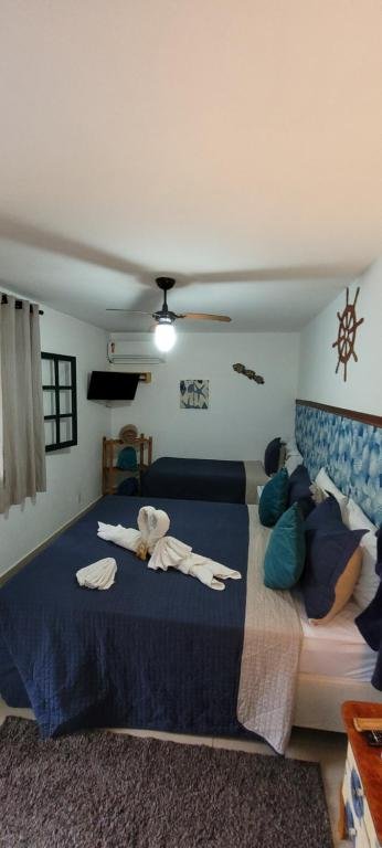 A Suíte Luxo acomoda até 3 pessoas, sendo indicada para casais com uma criança ou pequenos grupos. O ambiente oferece cama de casal e cama adicional, ar-condicionado, TV, frigobar, Wi-Fi, banheiro privativo e varanda, proporcionando maior conforto durante a estadia. O espaço é um pouco mais amplo que a categoria standard e permite momentos de descanso com mais comodidade, mantendo fácil acesso às áreas de lazer da pousada.