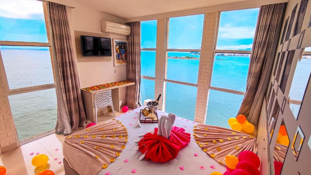 O hotel conta com 45 quartos confortáveis e climatizados, muitos com vista para o oceano, equipados com ar-condicionado, TV de tela plana, frigobar e banheiro privativo, proporcionando conforto funcional tanto para viagens a dois quanto para famílias.