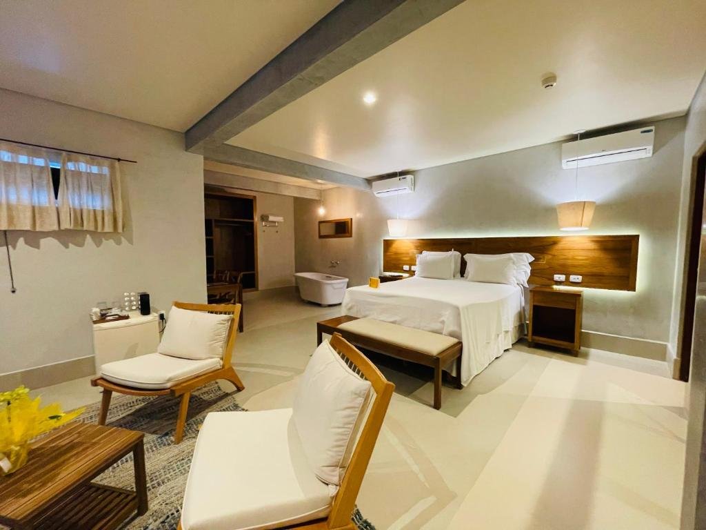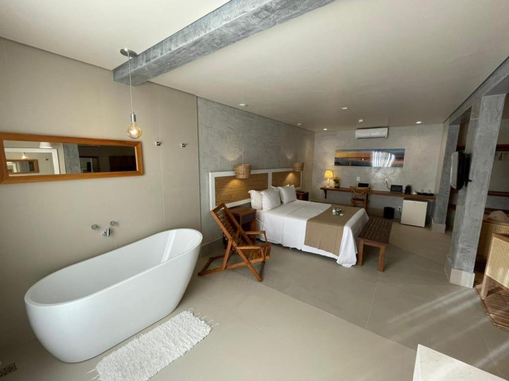 Suíte Yup – A Suíte Yup fica no piso térreo e possui aproximadamente 56 m², sendo ideal para até 2 pessoas. A acomodação conta com cama queen-size, ante-sala, armários amplos e varanda externa voltada para a área da piscina. O banheiro possui ducha dupla envidraçada, banheira de imersão e toalete independente. Entre os itens disponíveis estão TV com canais a cabo, minibar, secador de cabelo e amenidades de banho L’Occitane.