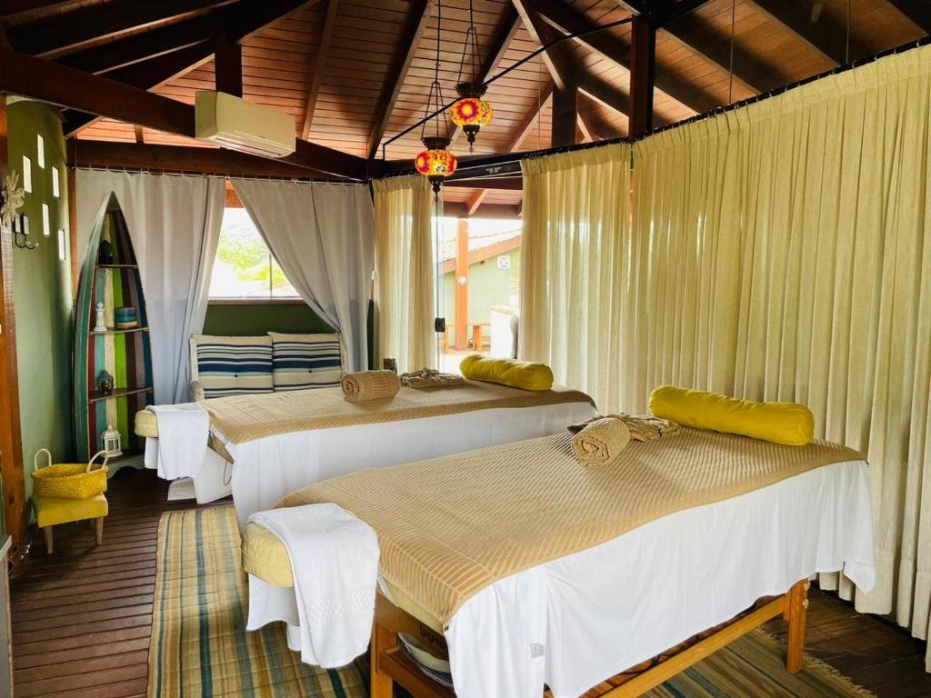 Suíte Double Hiu – A Suíte Double Hiu possui aproximadamente 30 m² e fica no piso superior do hotel. Indicada para até 4 pessoas, conta com duas camas de casal, varanda privativa e pé-direito alto. A acomodação inclui TV com canais a cabo, minibar, secador de cabelo e amenidades de banho L’Occitane, sendo uma opção prática para famílias ou pequenos grupos.
