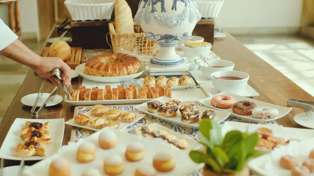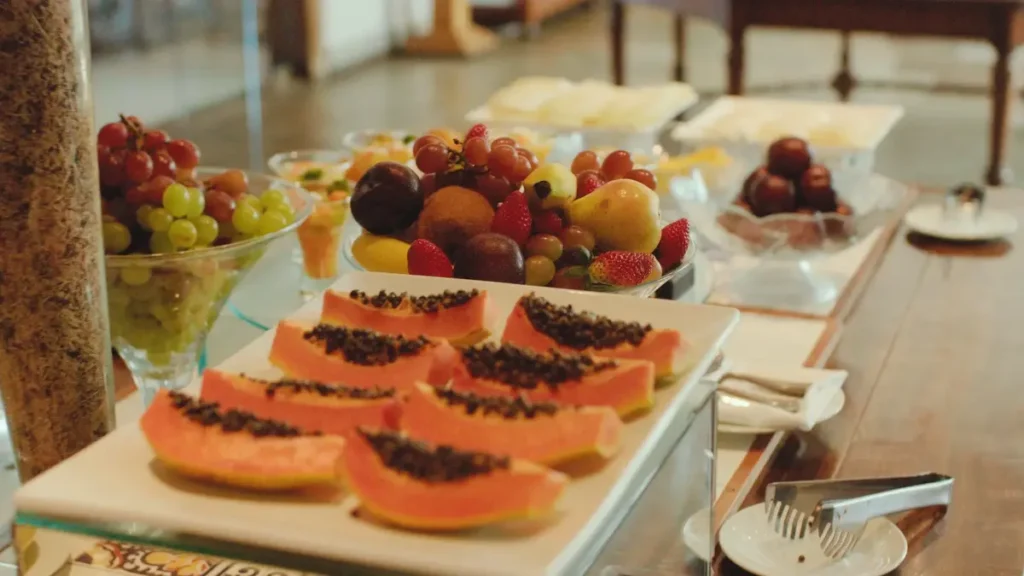 O café da manhã do Hotel é servido em formato de bufê fresco preparado diariamente para os hóspedes. A refeição inclui variedade de itens doces e salgados, acompanhamentos e bebidas, oferecendo uma experiência completa logo no início do dia em um ambiente de resort.
