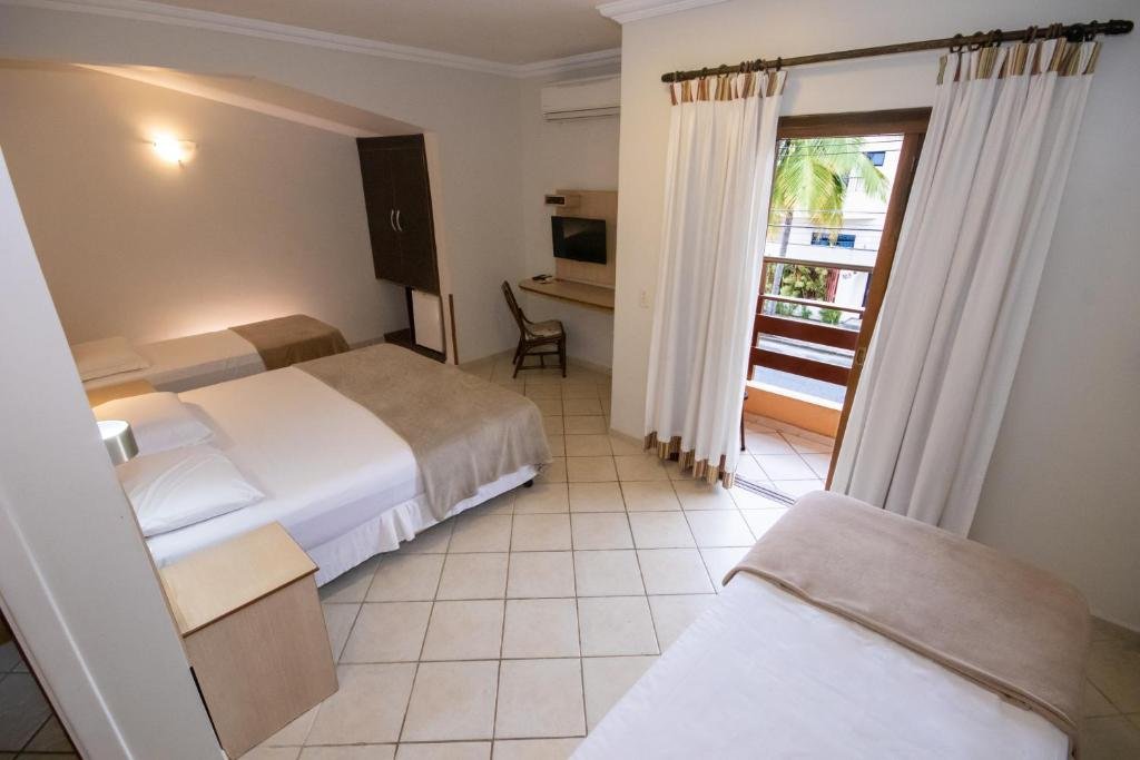 Os quartos Standard Triplo acomodam até 3 pessoas, com configuração de cama queen e cama de solteiro ou similar em um espaço um pouco maior que o Standard casal. As unidades mantêm os principais itens como ar-condicionado, TV e frigobar, oferecendo conforto extra para pequenas famílias ou grupos de amigos que querem aproveitar a localização próxima à praia e a estrutura de lazer do hotel sem abrir mão de acessibilidade e preço competitivo.