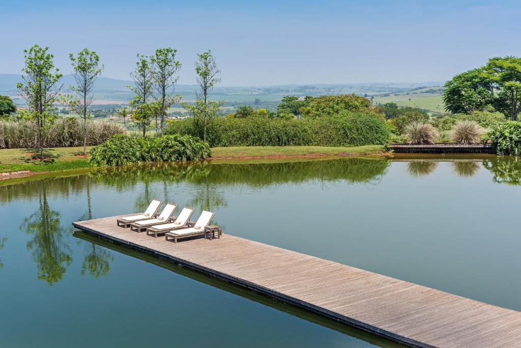 A piscina de borda infinita oferece uma vista panorâmica da paisagem da Fazenda Boa Vista, com o lago e o verde ao redor como cenário. Ideal para relaxar após um passeio pela fazenda, o ambiente transmite sensação de amplitude e integração com a natureza. A borda permite um visual contínuo do horizonte, favorecendo momentos de contemplação ou banho tranquilo em meio ao campo.