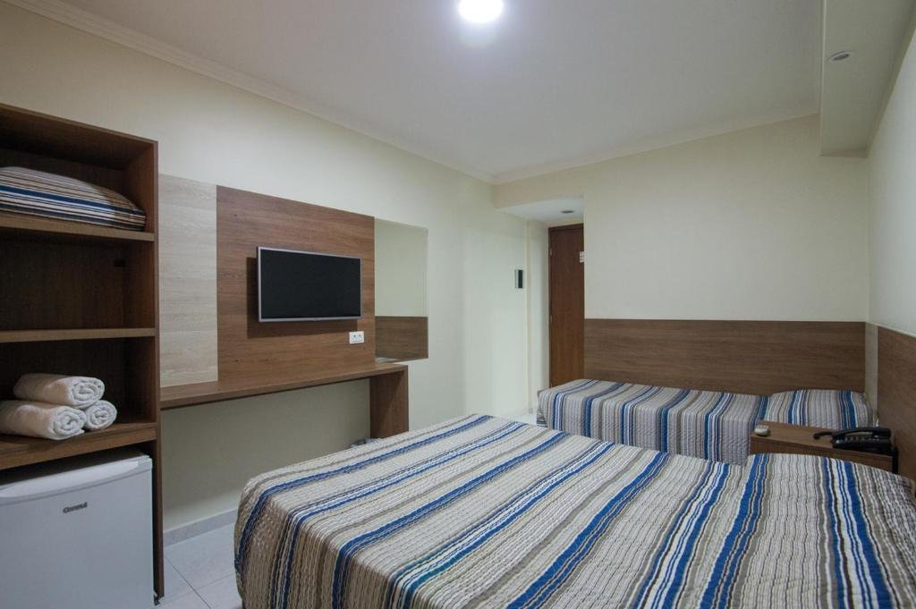 A acomodação tripla é indicada para até 3 hóspedes, normalmente com 1 cama de casal e 1 cama de solteiro, mantendo os principais itens de conforto: ar-condicionado, TV, Wi-Fi e banheiro privativo com chuveiro. Essa configuração atende bem pequenos grupos ou famílias, oferecendo um espaço prático e confortável para aproveitar as praias e as facilidades do bairro de Pitangueiras, com fácil acesso ao calçadão e ao centro do Guarujá.