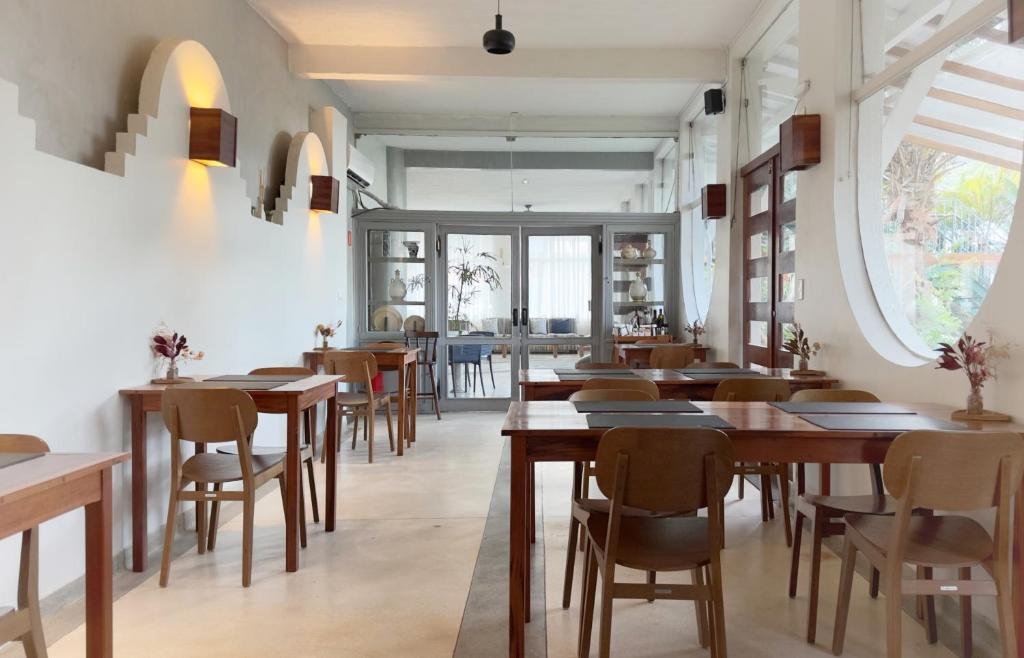 Ele apresenta uma seleção variada de itens frescos e saborosos, como pães e bolos artesanais, manteiga, geleias, queijos, frios, ovos, iogurtes e cereais, além de frutas tropicais da estação que refletem o clima praiano da região.