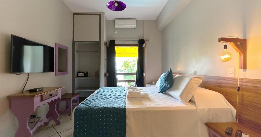 O Apartamento Superior Frente Mar acomoda até 2 pessoas e oferece cama de casal, ar-condicionado, TV LCD, frigobar e banheiro privativo, além de uma varanda com vista direta para o mar, perfeita para contemplar a Praia da Enseada. É ideal para casais ou viajantes em busca de conforto extra e localização privilegiada pé na areia, com Wi-Fi gratuito e serviço de limpeza diário.