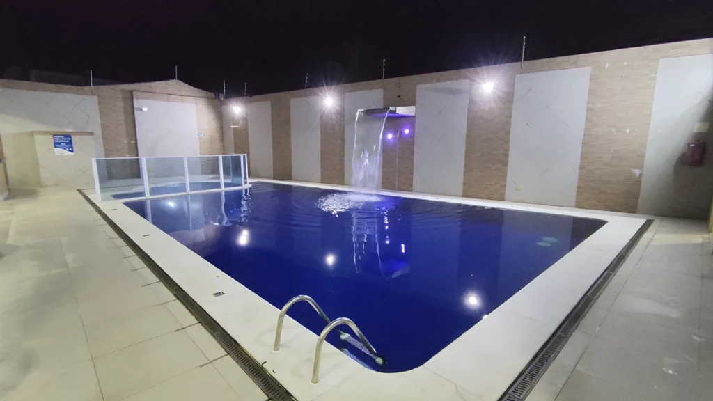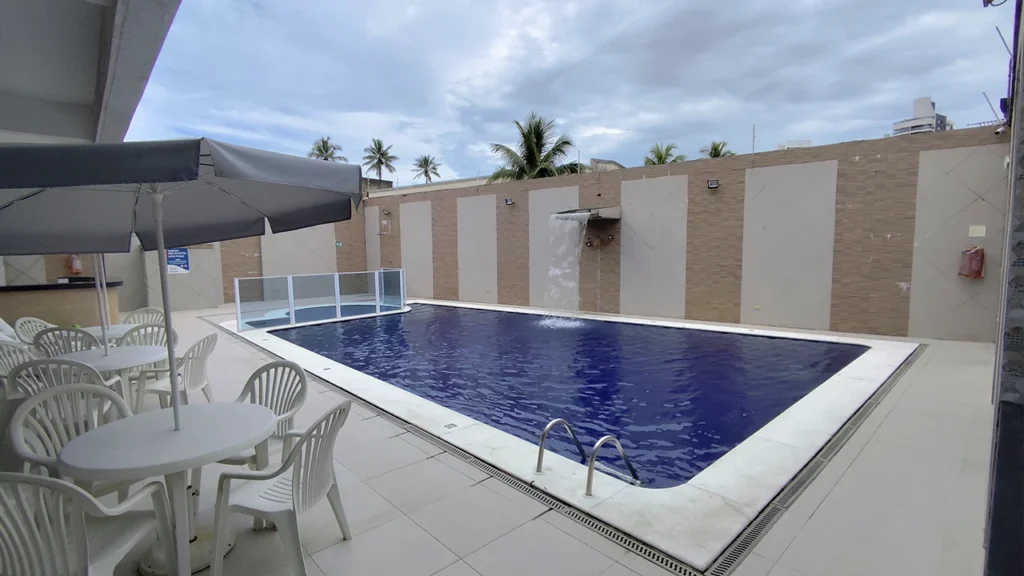 A piscina ao ar livre é um dos principais espaços de lazer do Hotel Santamaria, perfeita para momentos de relaxamento após um dia na Praia da Enseada. Situada em uma área comum externa, ela oferece um ambiente agradável para mergulhar, refrescar-se sob o sol e conversar com outros hóspedes em um clima descontraído. Por ser sazonal, a piscina costuma funcionar com maior frequência nos meses mais quentes, quando o clima de Guarujá é mais convidativo ao lazer ao ar livre. A presença de espreguiçadeiras e espaço ao redor permite relaxar à beira d’água, proporcionando uma experiência simples, mas satisfatória de descanso e diversão durante a estadia.