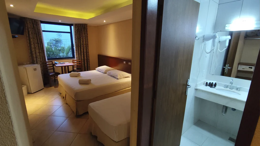 Os Quartos Standard acomodam confortavelmente até 2 adultos e 1 criança (berço disponível mediante pedido), com cerca de 21 m² de espaço funcional. Cada unidade é equipada com cama king-size e/ou cama de solteiro, ar-condicionado, TV LCD, frigobar, cofre, telefone, mesa de jantar, Wi-Fi gratuito e banheiro privativo. O ambiente é luminoso, arejado e pensado para oferecer conforto básico com conveniência durante a estadia, ideal para casais ou pequenas famílias que querem estar próximos da Praia da Enseada e das atrações do Guarujá.