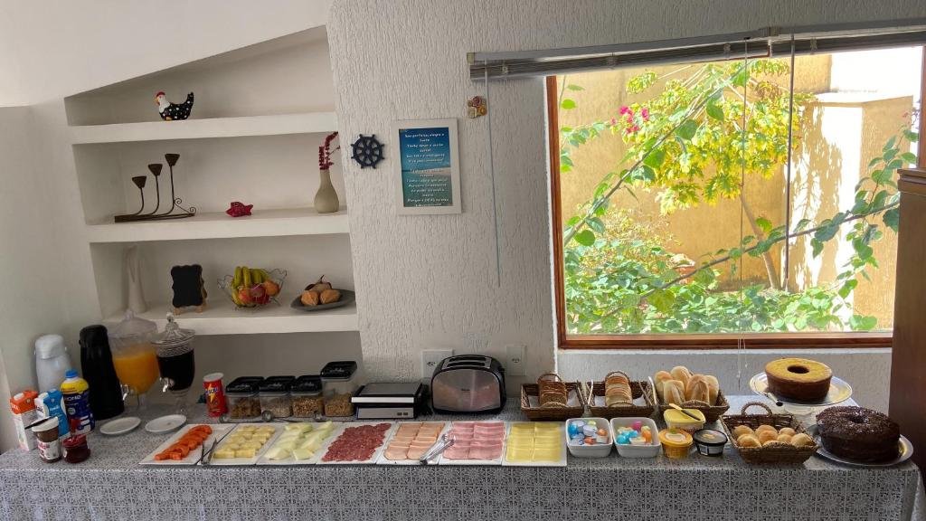 O cardápio inclui diferentes tipos de pães caseiros, bolos, salgados, cereais, frutas e sucos naturais, compondo uma refeição completa para começar o dia com energia antes de aproveitar as praias e atrações da região.