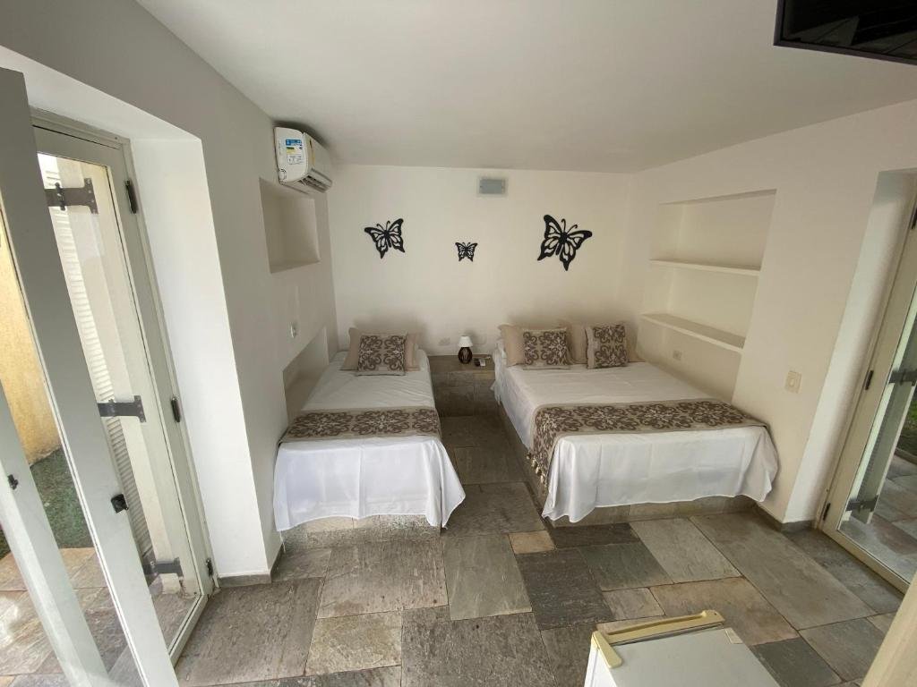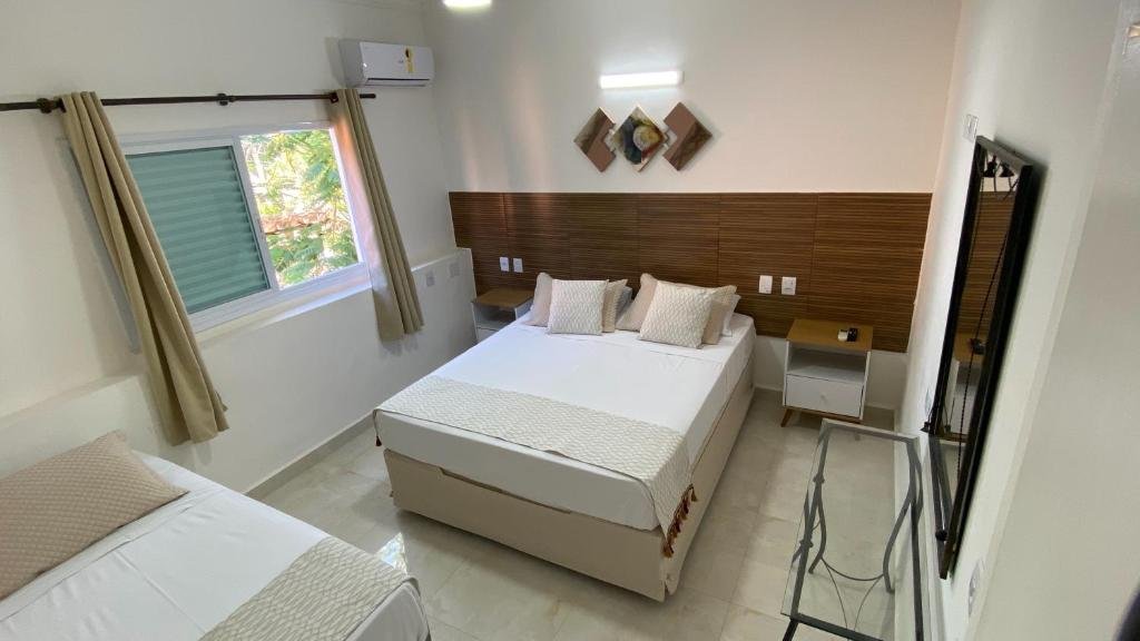 Suíte Família/Luxo (até 3 pessoas): possui cama de casal e cama extra de solteiro, além de ar-condicionado, Smart TV e Wi-Fi, sendo adequada para pequenas famílias ou grupos reduzidos que buscam comodidade próxima à praia.