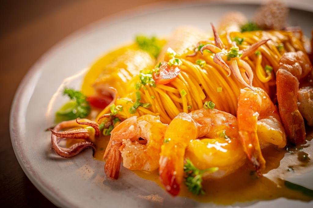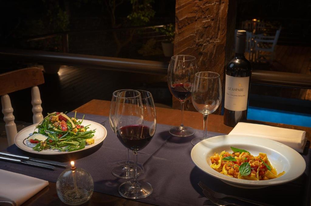 O cardápio apresenta culinária contemporânea com forte influência italiana e opções variadas de peixes, carnes, aves, risotos e massas, além de pratos vegetarianos, veganos e sem glúten, atendendo diferentes preferências alimentares.
