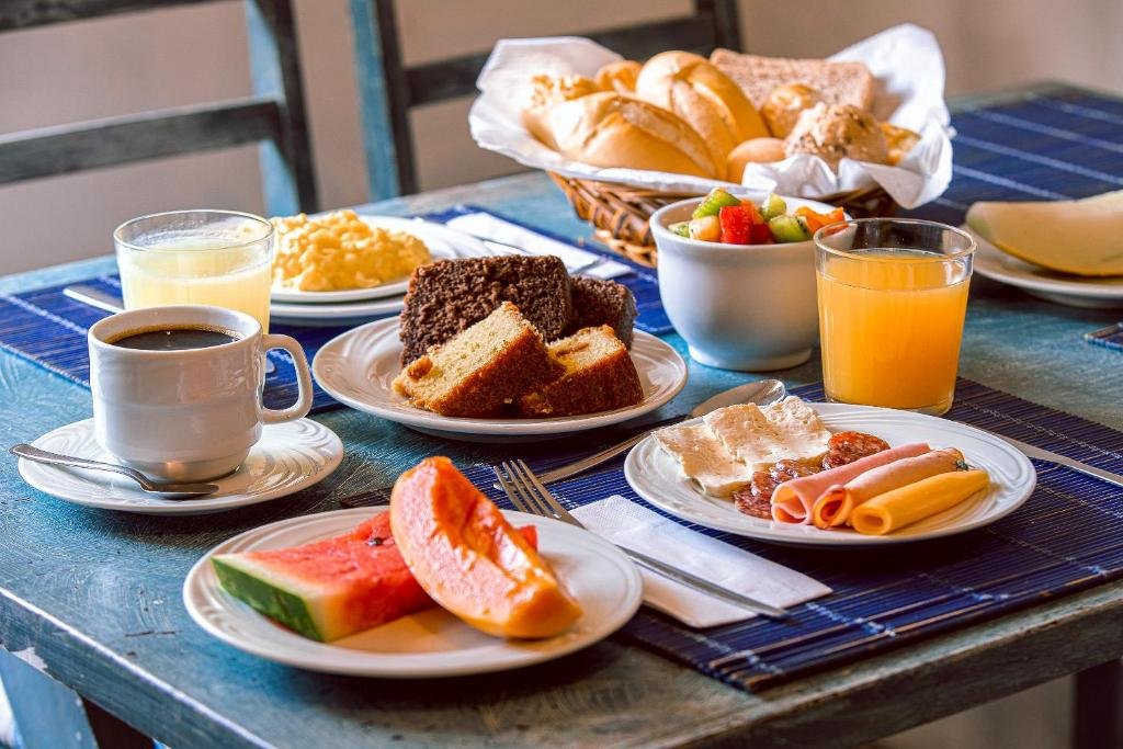 A refeição costuma apresentar um buffet variado, com opções como pães, frios, cereais, frutas frescas da estação e sucos naturais, além de café e outras bebidas quentes.