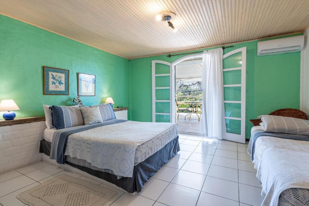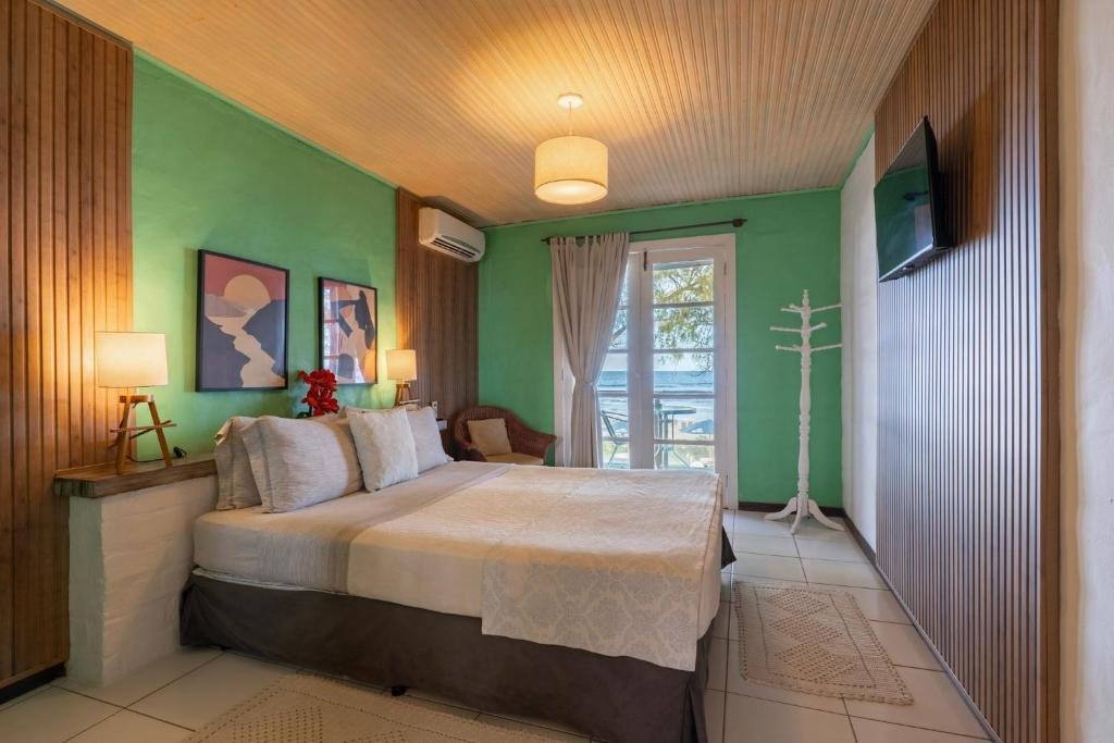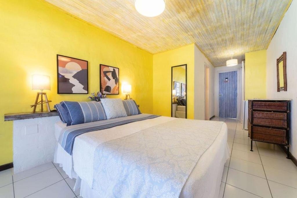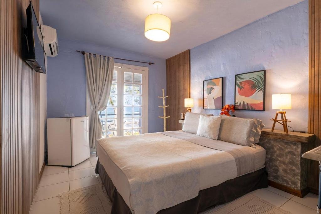 A Suíte Luxo Vista Mar acomoda até 2 pessoas e destaca-se pela vista privilegiada da Praia de Geribá. O quarto conta com cama de casal, varanda privativa voltada para o mar, ar-condicionado, TV, frigobar, cofre e banheiro privativo. O ambiente é ideal para casais que desejam aproveitar o visual do oceano e o clima praiano diretamente da acomodação.