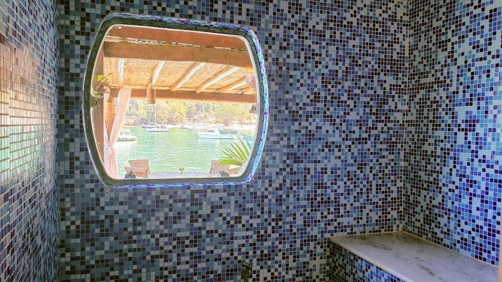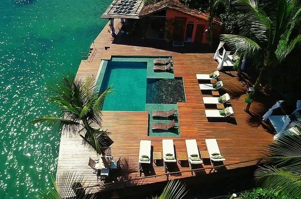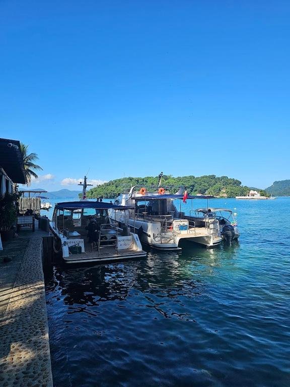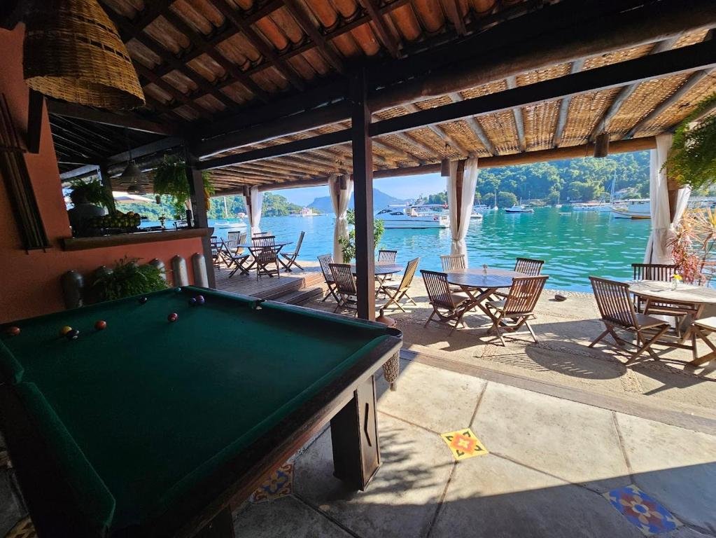 A piscina externa da pousada é um dos principais espaços de lazer, com borda infinita e vista direta para o mar, criando uma sensação de continuidade com a baía de Angra dos Reis. É perfeita para relaxar sob o sol, nadar ou simplesmente aproveitar o cenário tropical. Ao redor, há espreguiçadeiras e áreas para descanso, além de um serviço de bar onde é possível pedir bebidas e petiscos enquanto aprecia a paisagem. Por sua integração com o ambiente natural e a proximidade da área marítima, a piscina se torna um ponto de encontro agradável para hóspedes de todas as idades.