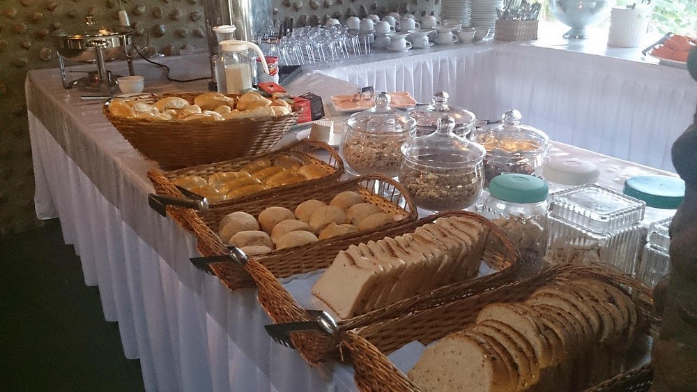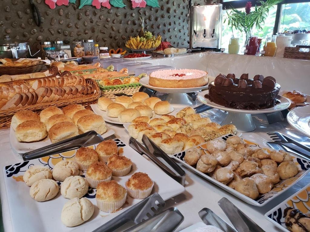 A refeição matinal é farta e diversificada, com opções de pães, bolos, frutas frescas, sucos naturais, frios, cereais e bebidas quentes como café e chá, proporcionando um início de dia saboroso e energético antes de aproveitar as atividades locais.