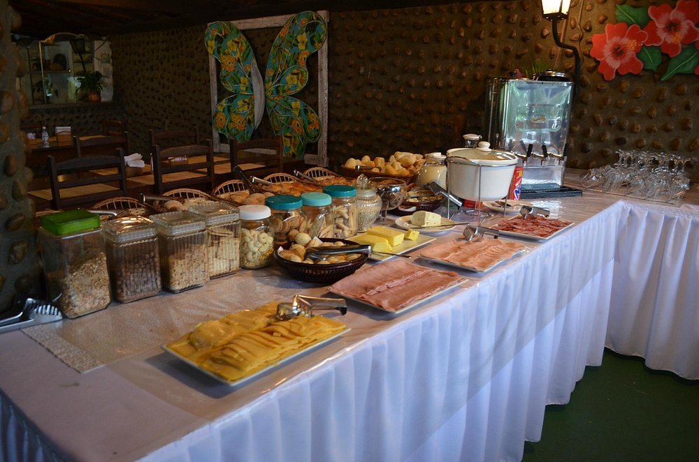 O café da manhã da Pousada Jamanta, em Angra dos Reis, é servido diariamente em estilo buffet com vista para o mar, geralmente entre 8h00 e 10h00, e está incluído na estadia dos hóspedes.