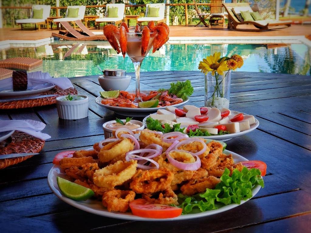 O restaurante serve especialidades da cozinha brasileira com opções de pratos de peixes, carnes e acompanhamentos, ideais após um dia de mergulho ou passeios pela costa.