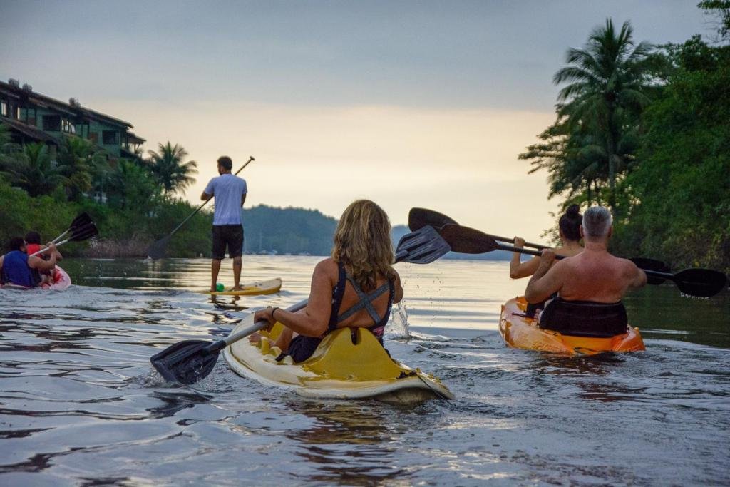 A pousada oferece acesso a uma área de praia privativa, onde os hóspedes podem desfrutar do mar com maior tranquilidade, em área de água calma e contato direto com a natureza. Nessa praia, é comum encontrar opções de caiaque e stand-up paddle incluídos, permitindo que visitantes explorem a costa local e se divirtam em atividades aquáticas sem custo extra. Essa proximidade com a água e a facilidade de uso dos equipamentos são frequentemente destacadas nas avaliações como parte importante da experiência de lazer, especialmente para famílias e casais que buscam diversão e contato com o mar.