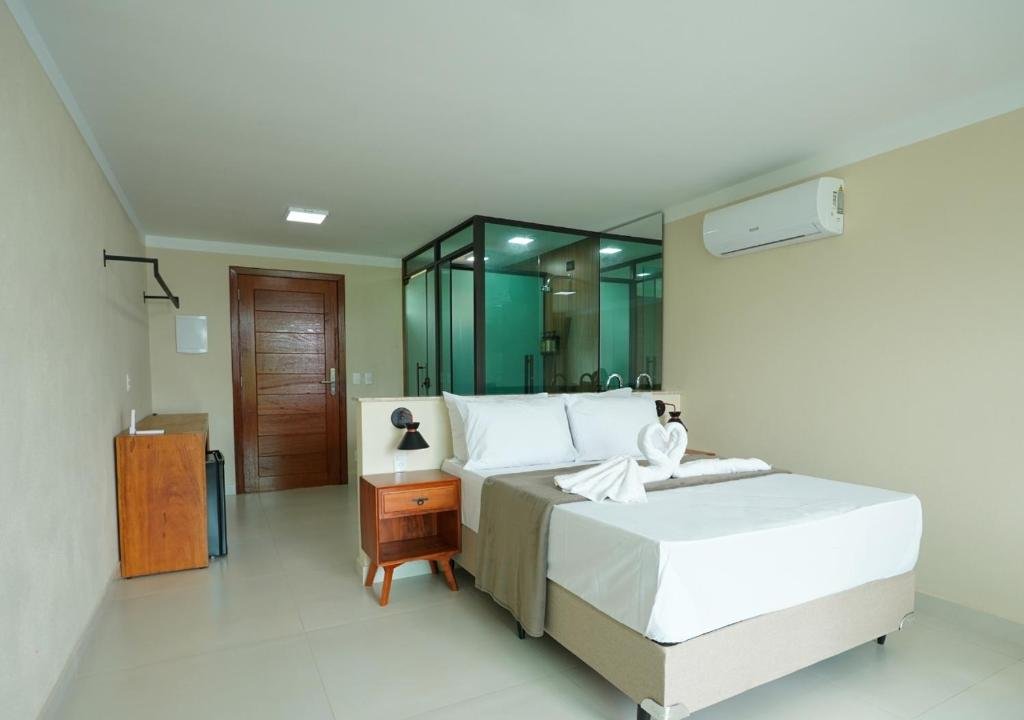 Suíte com Varanda – Projetada para até 2 ou 3 hóspedes, esta acomodação tem destaque pela varanda privativa com vistas panorâmicas, além de frigobar, Smart TV, ar-condicionado e Wi-Fi. A varanda proporciona um espaço relaxante para apreciar o pôr do sol ou o cenário costeiro da Ilha da Barra.