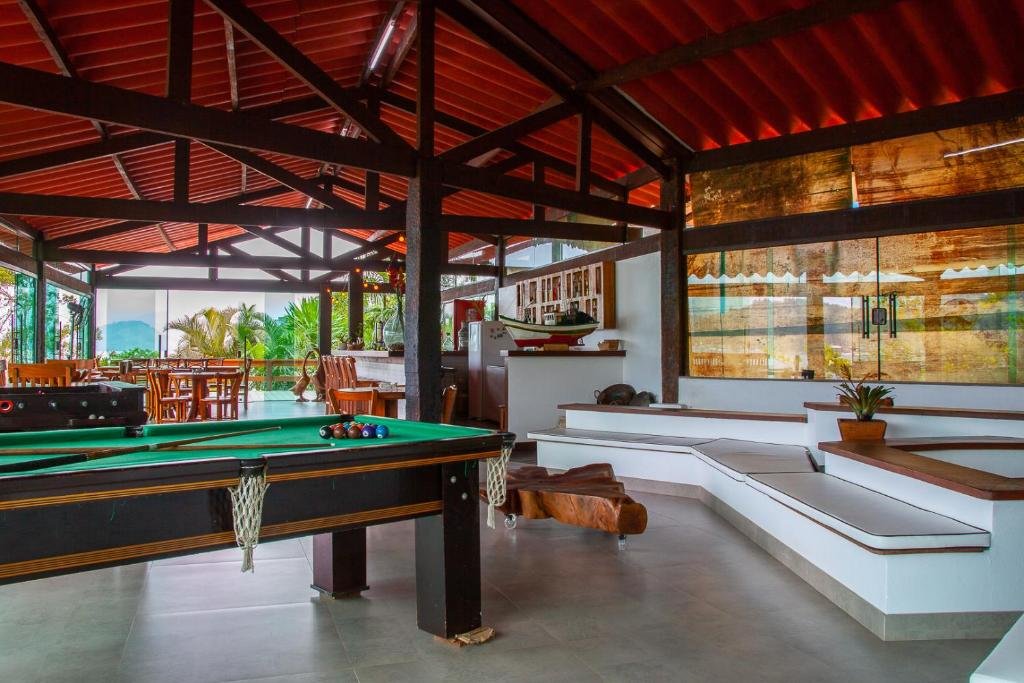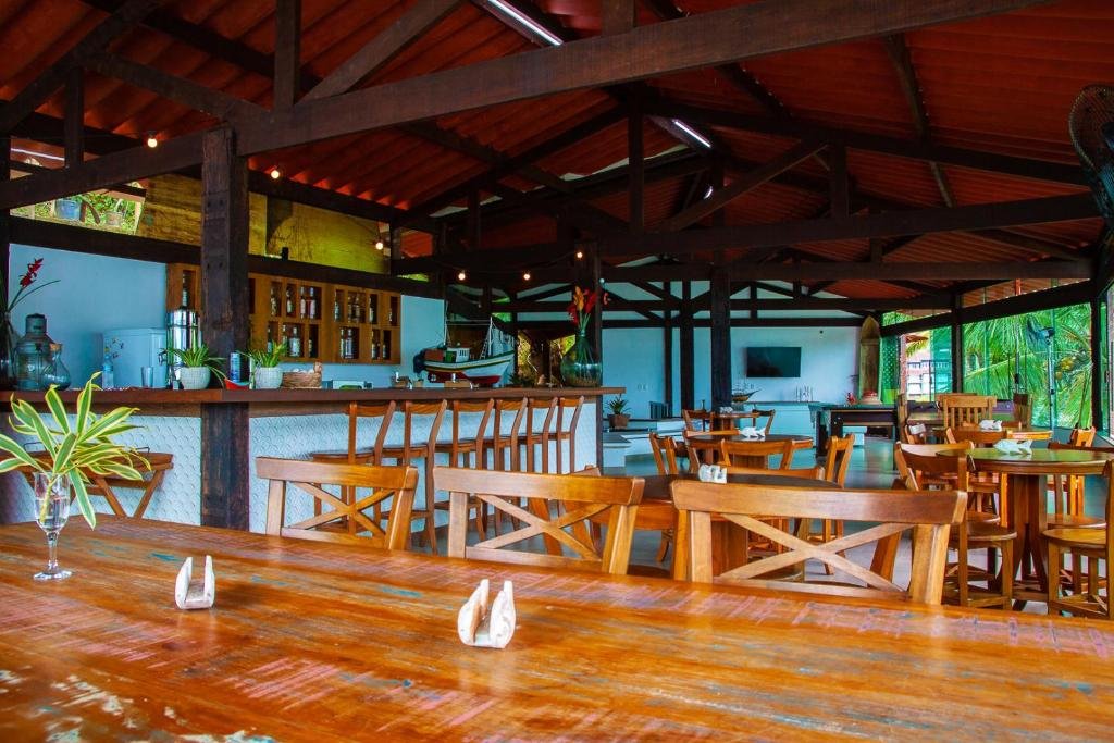 O estabelecimento conta com um restaurante com vista beira-mar, que serve pratos variados — de culinária brasileira a opções de frutos do mar — e bebidas, incluindo drinks e coquetéis preparados no local. Esse espaço se torna um ponto de encontro para refeições e momentos de convívio após um dia de praia ou piscina. Além do restaurante, há áreas sociais como bar e áreas externas onde hóspedes podem relaxar, apreciar a vista ou participar de jogos como bilhar, segundo avaliações de visitantes, ampliando as possibilidades de entretenimento dentro da própria pousada.