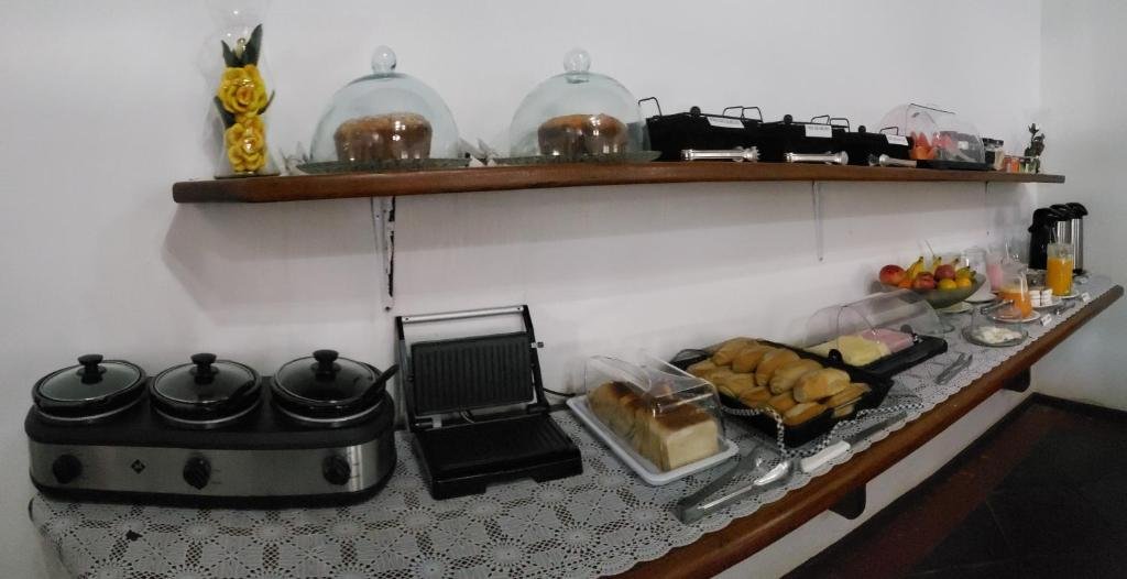 Entre os itens normalmente disponíveis estão pães variados, bolos caseiros, frutas da estação, frios, cereais e iogurtes, além de bebidas como café, leite, chás e sucos naturais. Em alguns dias também podem ser oferecidas opções quentes, como ovos mexidos ou preparações simples, complementando o buffet.