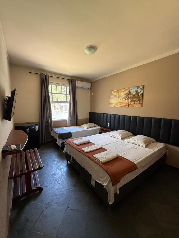 A Suíte Tripla é voltada para até 3 hóspedes, sendo adequada para pequenos grupos ou famílias. A configuração normalmente inclui uma cama de casal e uma cama de solteiro ou três camas individuais, além de ar-condicionado, televisão, frigobar, Wi-Fi e banheiro privativo. O ambiente é simples e acolhedor, oferecendo o espaço necessário para acomodar confortavelmente três pessoas durante a estadia.