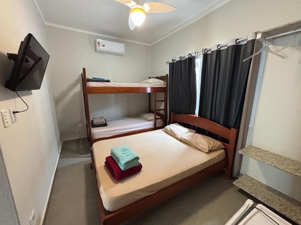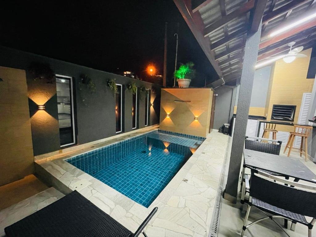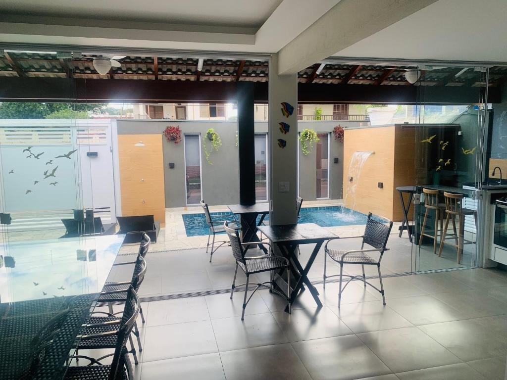 A pousada oferece acomodações confortáveis com ar-condicionado, Wi-Fi gratuito, TV, frigobar e micro-ondas em alguns quartos. Conta também com piscina ao ar livre climatizada, jardim, cozinha compartilhada e bar, proporcionando um ambiente agradável para descanso e lazer.