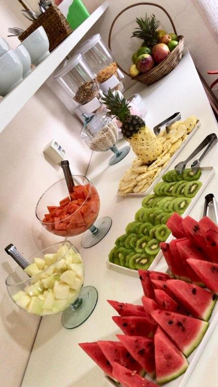No buffet, os hóspedes encontram itens típicos de um café da manhã completo, como frutas da estação, pães, frios e bebidas quentes e frias, compondo uma refeição equilibrada e adequada a diferentes preferências.