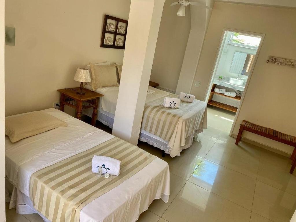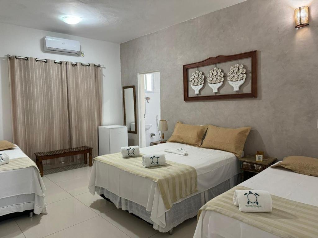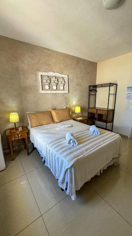 Suíte Standard Duplo (2 pessoas): indicada para casais, dispõe de uma cama de casal e ambiente compacto, além de ar-condicionado, frigobar, TV, Wi-Fi e banheiro privativo. É uma opção funcional para quem busca conforto essencial próximo à praia.
