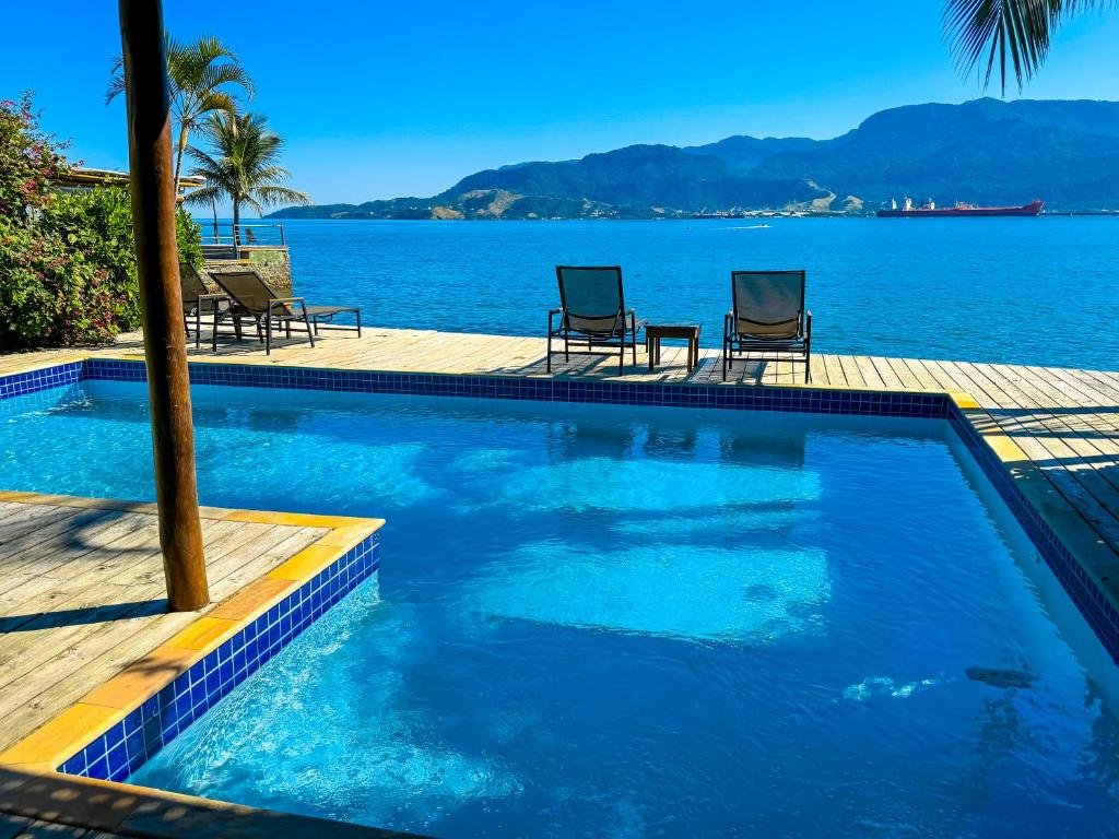 A pousada oferece três piscinas, sendo duas climatizadas e uma com temperatura ambiente, proporcionando opções de lazer aquático em qualquer época do ano. As áreas aquáticas são ambientes ideais para relaxar sob o sol ou à sombra, com fácil acesso ao bar junto às piscinas, onde é possível desfrutar de drinks e petiscos em meio à paisagem de Ilhabela. A presença de uma jacuzzi/hot tub torna a experiência ainda mais confortável para quem busca descanso após passeios ou praias, com atmosfera tranquila e integrada à natureza local.