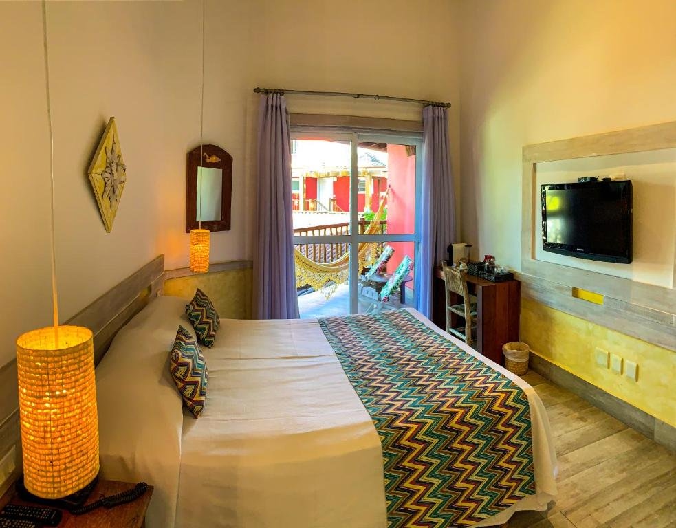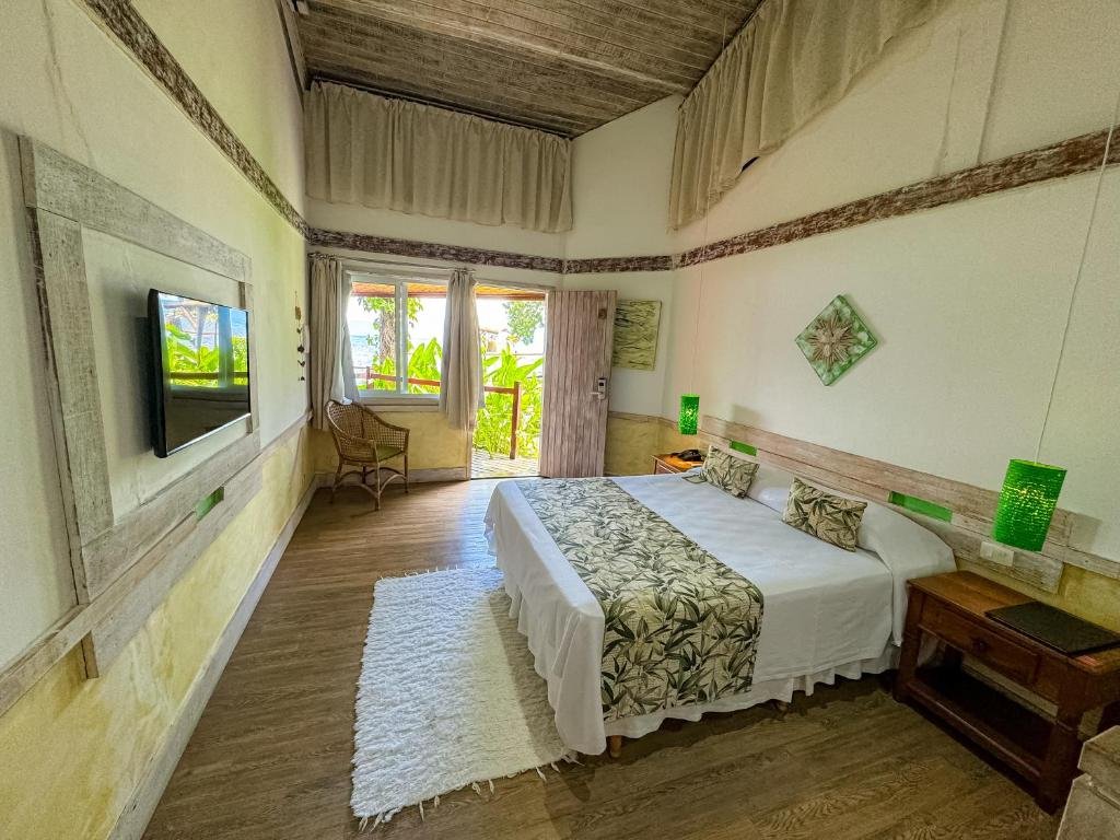 Os Bangalôs com vista para o mar acomodam até 2 pessoas e proporcionam uma experiência acolhedora com varanda privativa e vista panorâmica do oceano. Todos incluem ar-condicionado, Smart TV, frigobar, banheiro privativo com chuveiro e varanda, combinando conforto e clima praiano. A proximidade com a área das piscinas e o bar torna essa opção ideal para quem busca relaxar com a brisa do mar e fácil acesso às áreas de lazer da pousada.