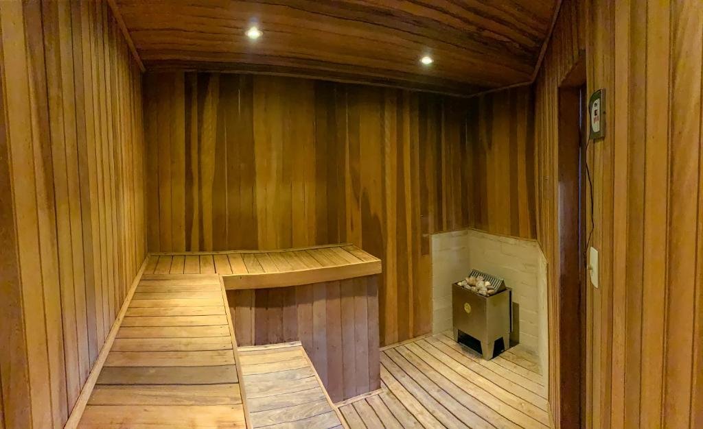 A estrutura de lazer inclui sauna seca e sala de vapor, ambientes voltados ao bem-estar e relaxamento, perfeitos para aliviar tensões musculares e renovar as energias. Esses espaços complementam a proposta de tranquilidade da pousada, permitindo que os hóspedes relaxem confortavelmente antes ou depois do uso das piscinas. A sauna e vapor são excelentes para quem deseja um momento de pausa e cuidado pessoal durante a viagem.