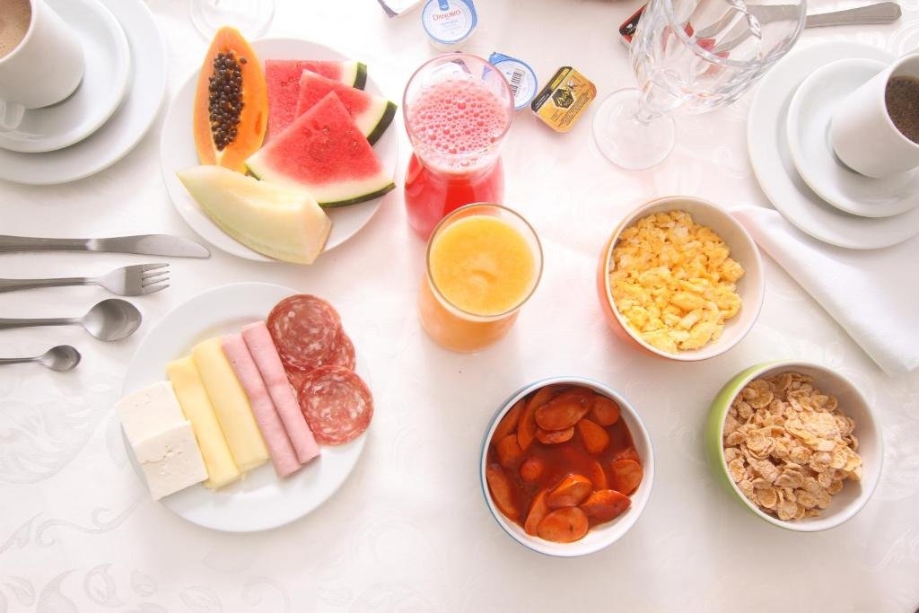 O café da manhã oferecido aos hóspedes é servido diariamente em formato de buffet, reunindo variedade de sabores e preparações voltadas a um início de dia completo. Entre as opções disponíveis estão especialidades locais, pratos quentes, pães e doces frescos, além de queijos, frutas e sucos, compondo uma refeição equilibrada e diversificada.