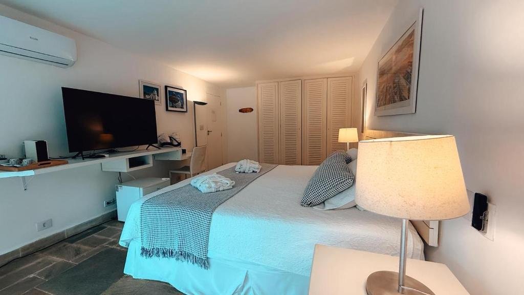 Indicada para até duas pessoas, a Suíte Standard dispõe de um quarto com cama de casal, ar-condicionado, banheiro privativo com chuveiro e bidê, além de TV de tela plana com serviços de streaming, frigobar e Wi-Fi gratuito. A unidade oferece itens de conforto como secador de cabelo, roupas de cama, toalhas e mobiliário externo, destacando-se ainda pela vista para a piscina em algumas configurações. O café da manhã está incluído na diária, reforçando a proposta de hospedagem prática e confortável.