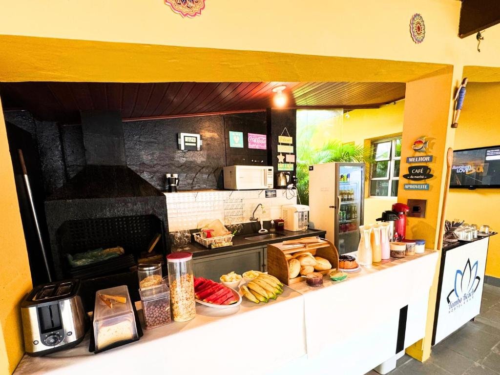 O terraço é outro espaço utilizado para lazer e convivência, oferecendo um ambiente aberto onde os hóspedes podem relaxar durante diferentes momentos do dia. Esse espaço costuma ser utilizado tanto para descanso quanto para socialização, com áreas para sentar e apreciar o clima da Praia do Tombo.