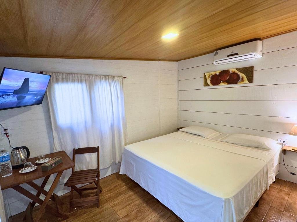 Bangalô de Madeira – O bangalô é uma opção mais reservada e acolhedora para até 2 hóspedes. A unidade conta com 1 cama king-size, banheiro privativo e estrutura semelhante às suítes, incluindo ar-condicionado, TV, Wi-Fi e itens básicos de hospedagem. O ambiente oferece um estilo mais rústico e tranquilo, ideal para quem busca maior privacidade e uma experiência de hospedagem próxima à natureza e ao clima praiano da região.
