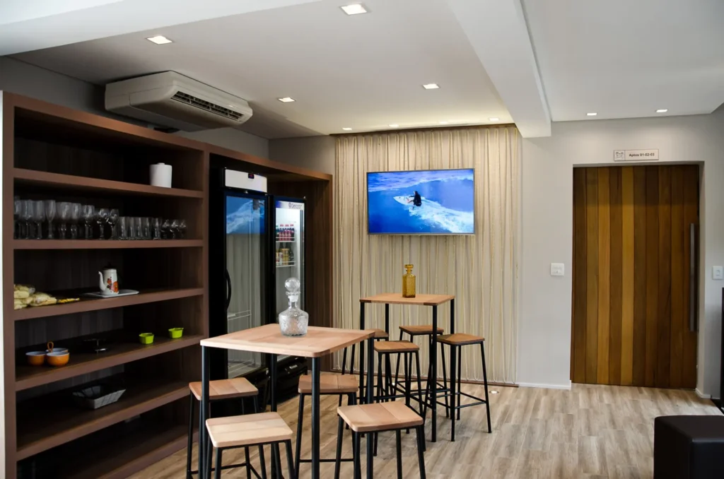 Esse espaço é especialmente útil em dias de chuva ou para quem busca uma opção de lazer diferente da piscina ou do ambiente externo. Oferece um ponto de encontro social dentro da propriedade, agregando valor à experiência de estadia para adultos e crianças.