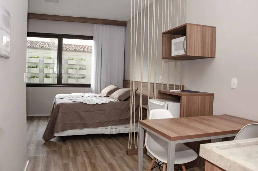 Esse espaço complementa a atmosfera relaxante do aparthotel e é ideal para momentos de leitura, conversas tranquilas ou simplesmente aproveitar a brisa litorânea. O jardim também contribui para a sensação de paz e bem-estar, criando um cenário verde e acolhedor entre os apartamentos e a piscina.