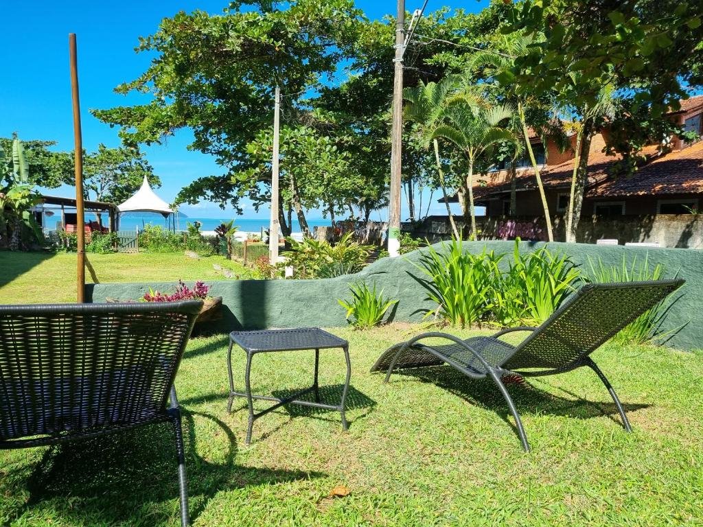 O gramado e o terraço convidam hóspedes a aproveitar o clima tropical de Ubatuba em uma atmosfera tranquila e aconchegante, complementando bem a experiência à beira-mar.